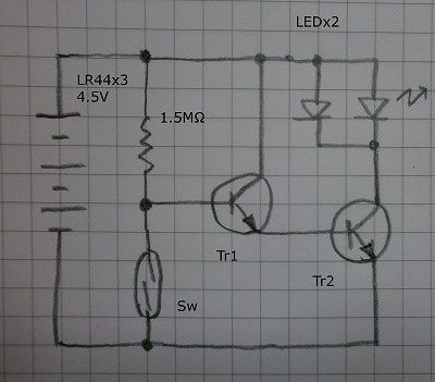 本来はLEDと直列に抵抗を入れるのがセオリーですが、 ボタン電池で電流があまり流れないので省略されています。 スイッチがoffすると[ (4.5-0.6*2)/1.5M≒2.2μA ]のベース電流が流れTrがonします。 2.2μAがhfe100のダーリントンだと22mAのLED電流です。いい値ですね。 | ![]() |