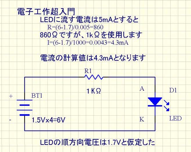 電圧は電池の 6V からLEDの 1.7V を引きます。(6-1.7=4.3V)