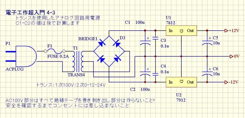 - 2次側は 0-10Vでも 0-12Vでも使用できますが、次の製作を考えて 0V--12V--24Vの巻線のトランスの 0--12を使用します。