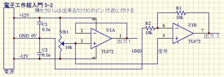 図5-4で Inが 1Vなら 6pinも 5pinと短絡なので 1V、更に R2も 1V、R1も 1Vで Outは 2V:別の見方をすると Outの 1/2が Inと同じ。